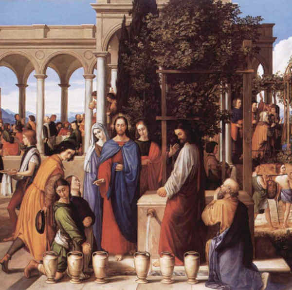 圣经经文:第三天,在加里肋亚加纳有婚宴,耶稣的母亲在那里;耶稣和他的门徒也被请去赴婚宴。酒缺了,耶稣的母亲向他说:「他们没有酒了。」耶稣回答说:「女人,这于我和你有什么关系?我的时刻尚未来到。」他的母亲给仆役说:「他无论吩咐你们什么,你们就作什么。」在那里放着六口石缸,是为犹太人的取洁礼用的;每口可容纳两三桶水。耶稣向仆役说:「你们把缸灌满水罢!」他们就灌满了,直到缸口。然后,耶稣给他们说:「现在你们舀出来,送给司席。」他们便送去了。司席一尝已变成酒的水──并不知是从哪里来的,舀水的仆役却知道──司席便叫了新郎来,向他说:「人人都先摆上好酒,当客人都喝够了,才摆上次等的;你却把好酒保留到现在。」这是耶稣所行的第一个神迹,是在加里肋亚加纳行的;他显示了自己的光荣,他的门徒们就信从了他。(若望福音2:1-11)